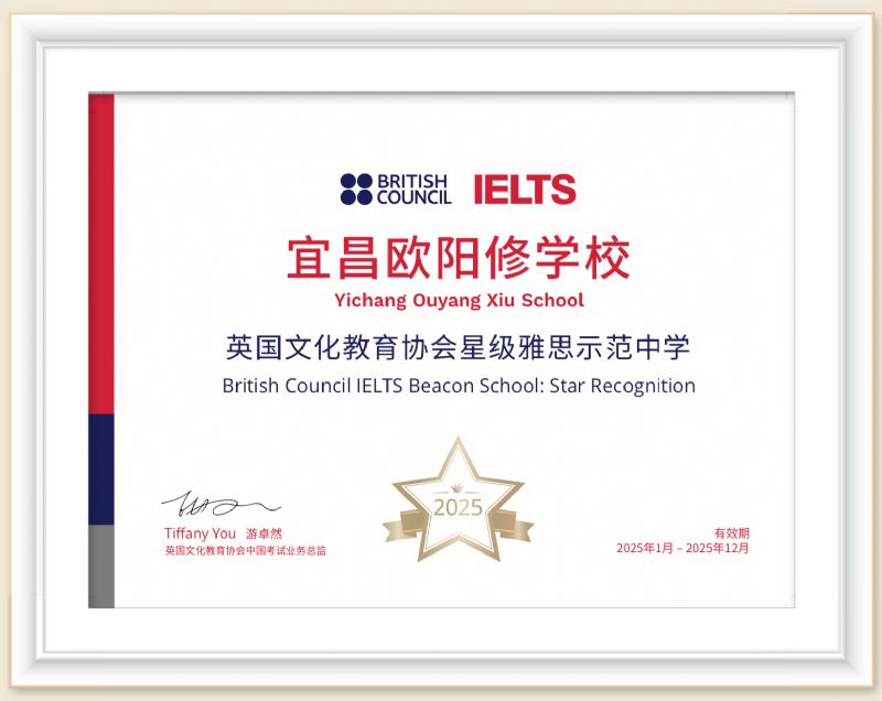 宜昌歐陽修學?,F(xiàn)設(shè)有普通高中和國際高中。20多年來,學校先后獲得“宜昌市區(qū)域現(xiàn)代化先進學校”、“宜昌市優(yōu)秀民辦學?!钡戎T多榮譽稱號,是宜昌市唯一被英國文化教育協(xié)會BritishCouncil授牌的“星級雅思示范中學”、“雅思教師培訓基地”和“Aptis普思考點示范學校”、“三峽大學外國語學院學科教學英語研究生工作站”。2023年7月,中國工程院院士,香港中文大學(深圳)校長徐楊生先生為宜昌歐陽修學校題寫校名。