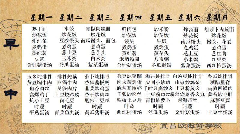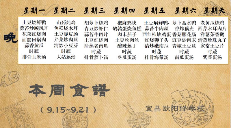 宜昌歐陽修學校每周食譜(9月15日-9月21日)